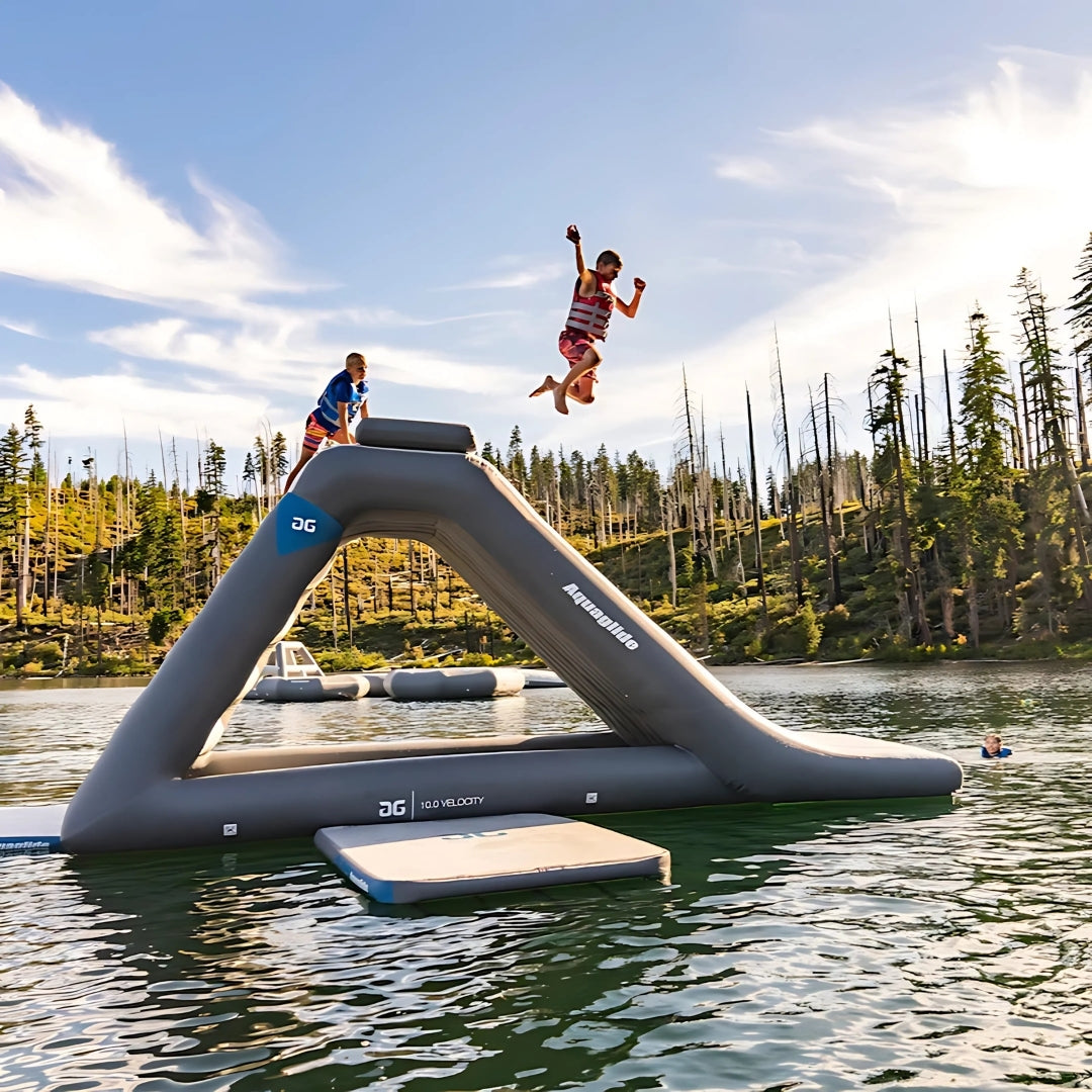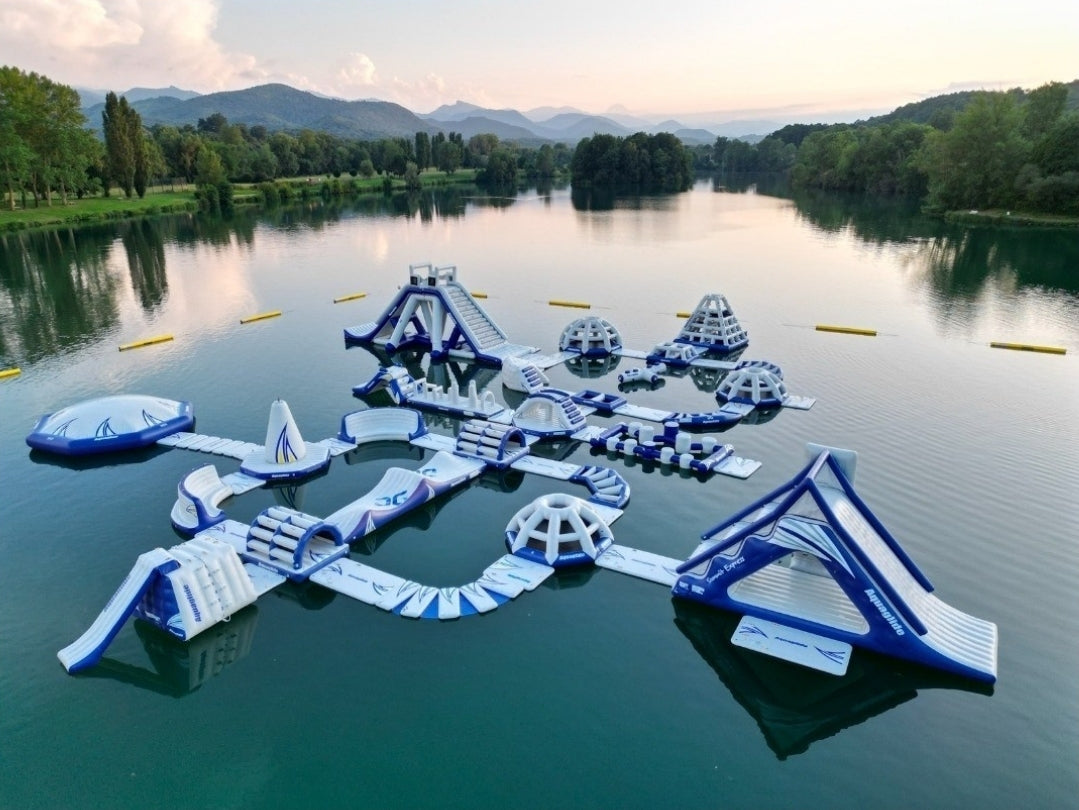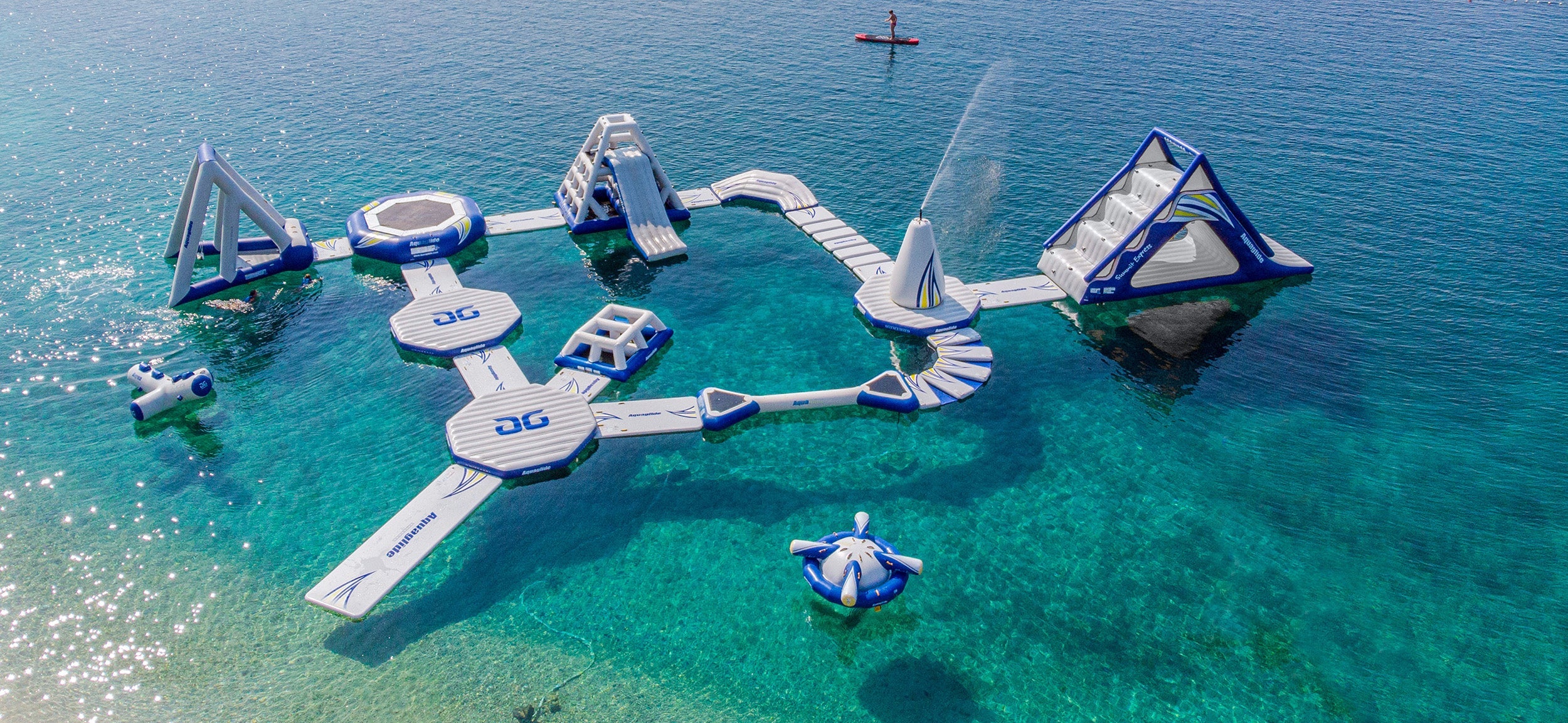 Featuring Aquaglide aqua park waterfront inflatables and Slick Slides.