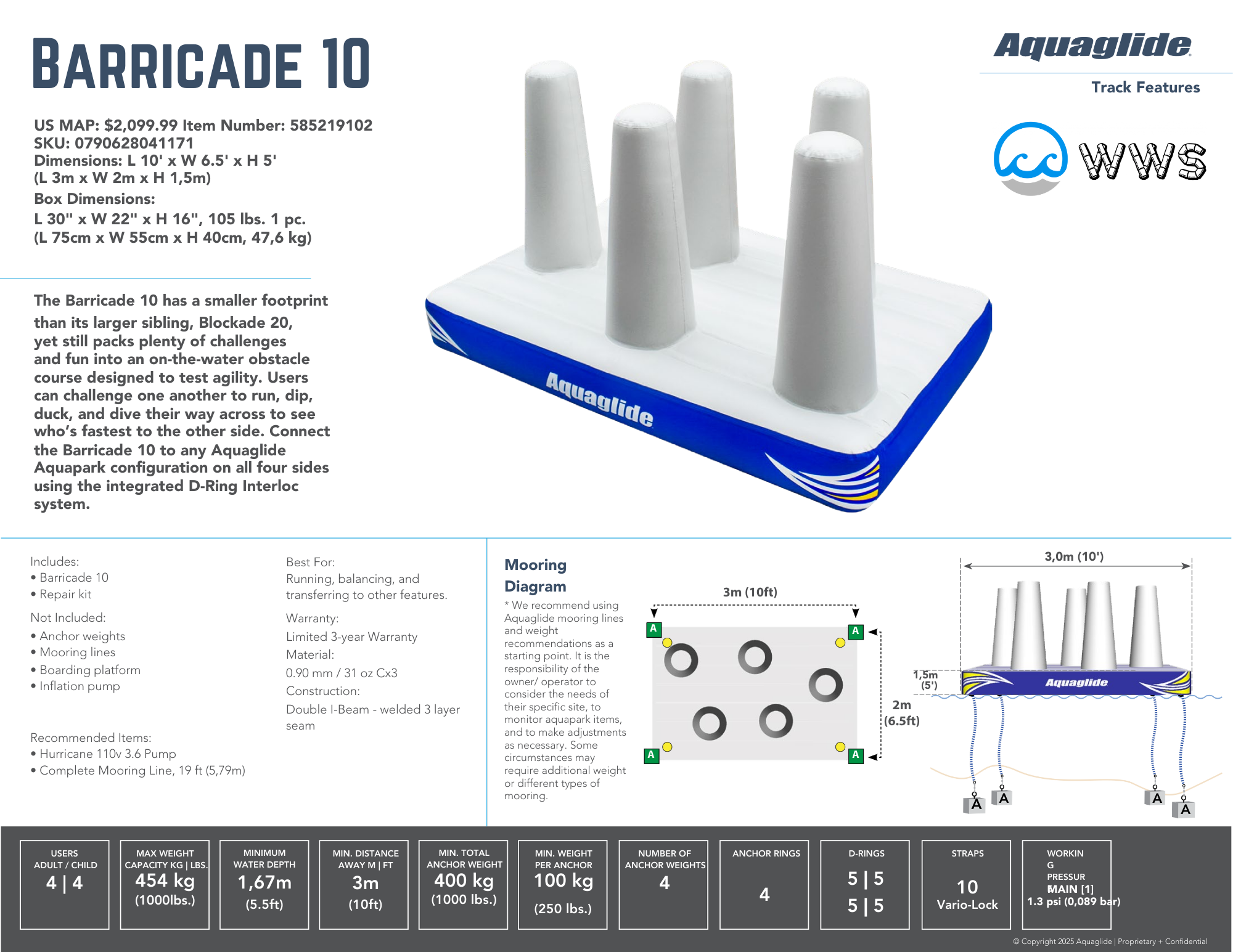 The Barricade 10 has a smaller footprint than its larger sibling, Blockade 20, yet still packs plenty of challenges and fun into an on-the-water obstacle course designed to test agility. Users can challenge one another to run, dip, duck, and dive their way across to see who's fastest to the other side. Connect the Barricade 10 to any Aquaglide Aquapark configuration on all four sides using the integrated D-Ring Interloc system.