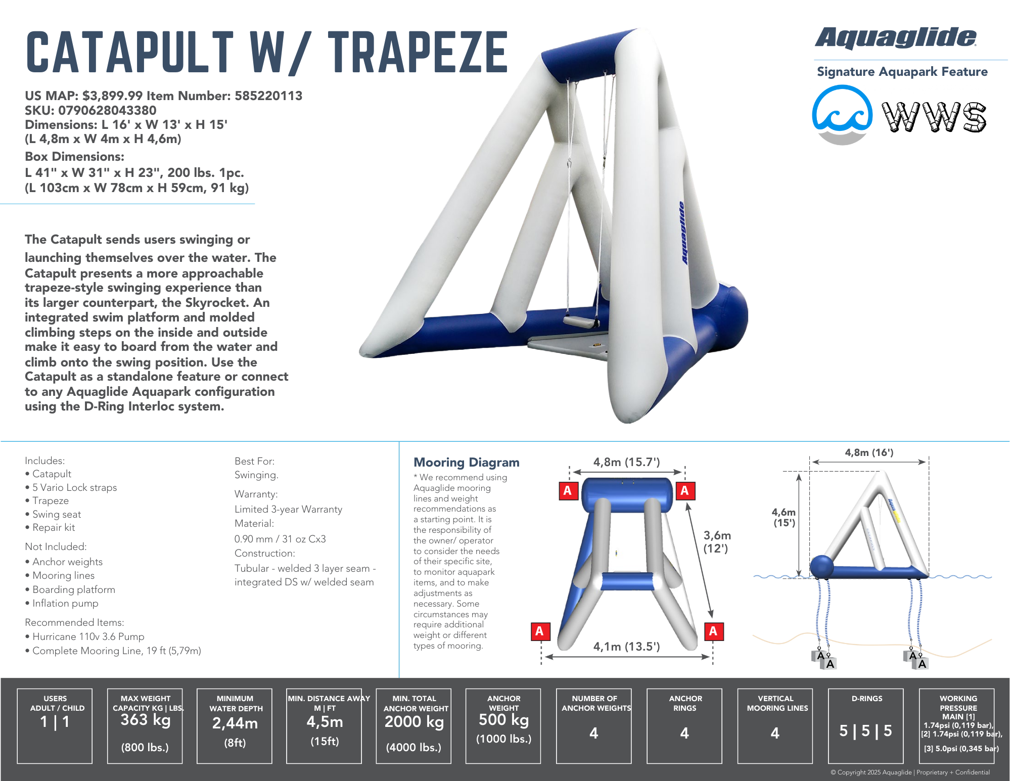 An integrated swim platform and molded climbing steps on the inside and outside make it easy to board from the water and climb onto the swing position. Use the Catapult as a standalone feature or connect to any Aquaglide Aquapark configuration using the D-Ring Interloc system.