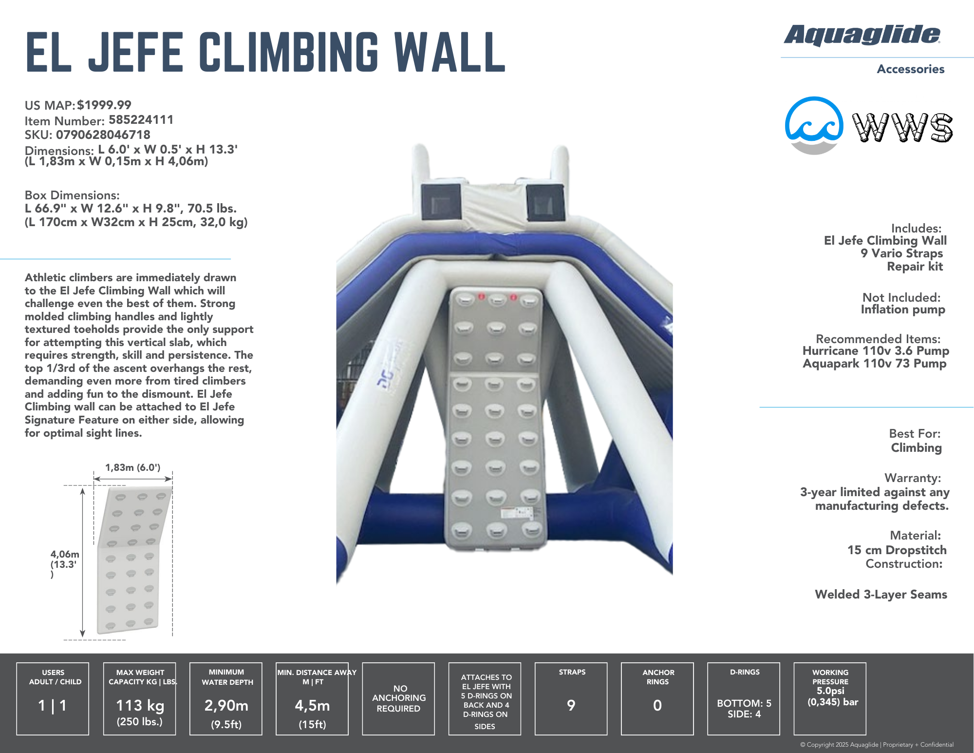 The top 1/3rd of the ascent overhangs the rest, demanding even more from tired climbers and adding fun to the dismount. El Jefe Climbing wall can be attached to El Jefe Signature Feature on either side, allowing for optimal sight lines.
