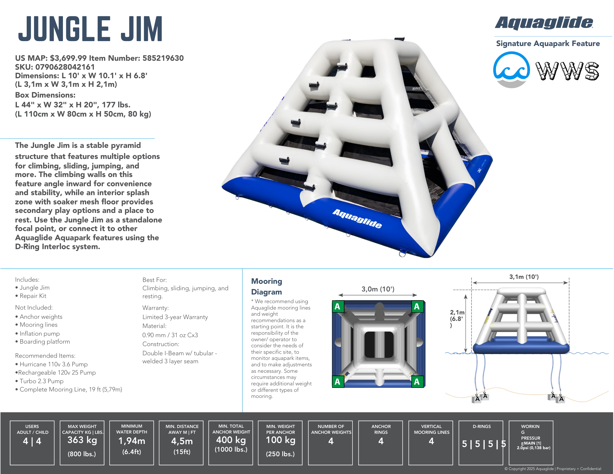 The Jungle Jim is a stable pyramid structure that features multiple options for climbing, sliding, jumping, and more. The climbing walls on this feature angle inward for convenience and stability, while an interior splash zone with soaker mesh floor provides secondary play options and a place to rest. Use the Jungle Jim as a standalone focal point, or connect it to other Aquaglide Aquapark features using the D-Ring Interloc system.