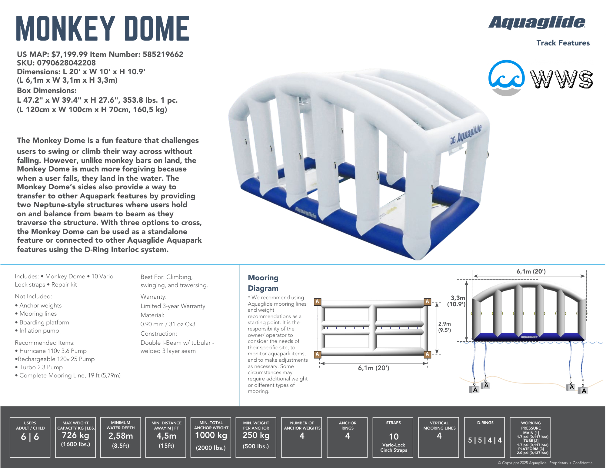 The Monkey Dome is a fun feature that challenges users to swing or climb their way across without falling. However, unlike monkey bars on land, the Monkey Dome is much more forgiving because when a user falls, they land in the water. The Monkey Dome's sides also provide a way to transfer to other Aquapark features by providing two Neptune-style structures where users hold on and balance from beam to beam as they traverse the structure. With three options to cross, the Monkey Dome can be used as a standalone feature or connected to other Aquaglide Aquapark features using the D-Ring Interloc system.