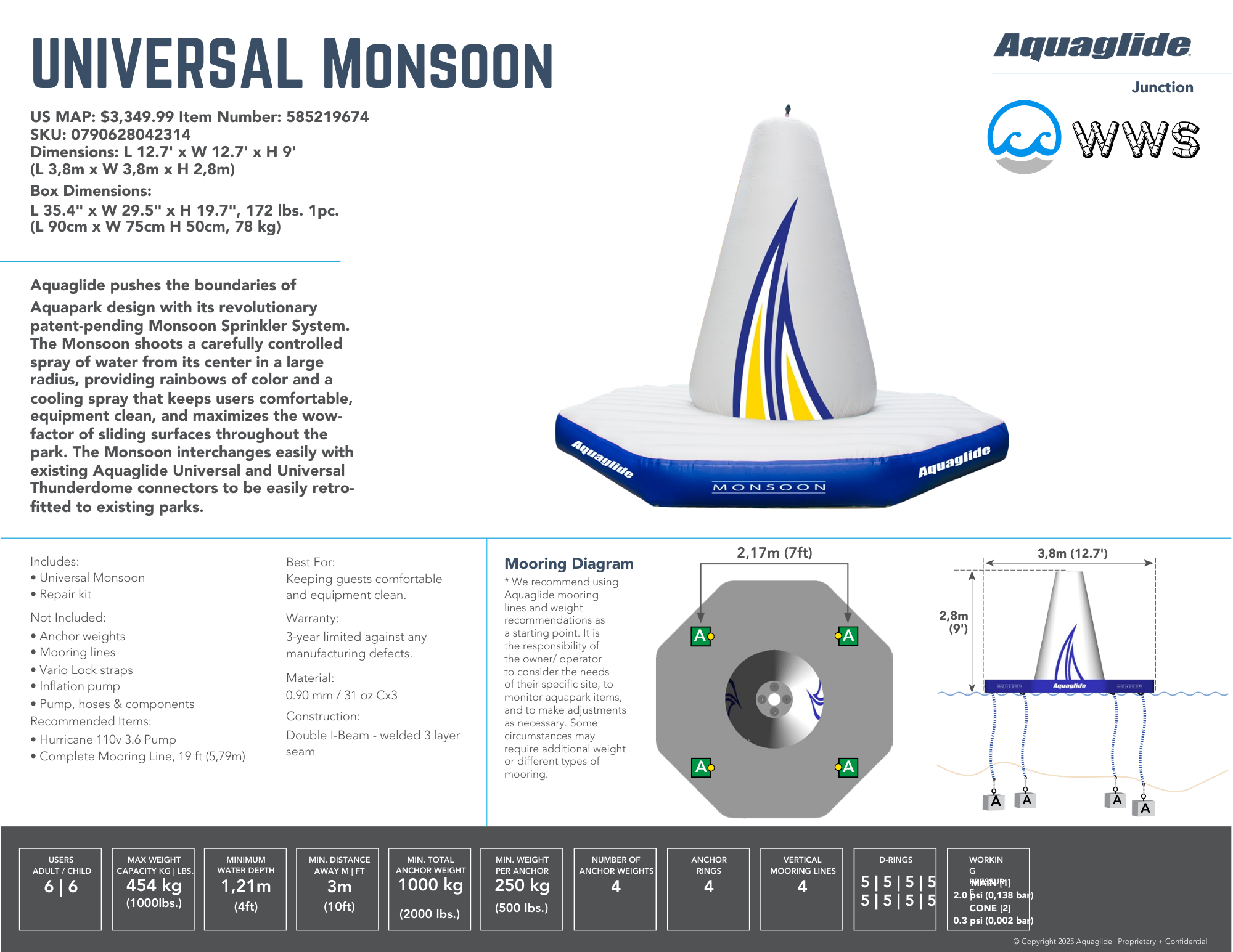 The Monsoon shoots a carefully controlled spray of water from its center in a large radius, providing rainbows of color and a cooling spray that keeps users comfortable, equipment clean, and maximizes the wow-factor of sliding surfaces throughout the park. The Monsoon interchanges easily with existing Aquaglide Universal and Universal Thunderdome connectors to be easily retrofitted to existing parks.