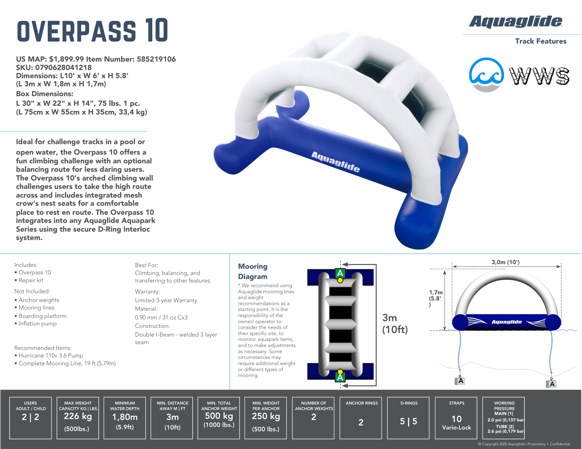 Ideal for challenge tracks in a pool or open water, the Overpass 10 offers a fun climbing challenge with an optional balancing route for less daring users. The Overpass 10's arched climbing wall challenges users to take the high route across and includes integrated mesh crow's nest seats for a comfortable place to rest en route. The Overpass 10 integrates into any Aquaglide Aquapark Series using the secure D-Ring Interloc system.