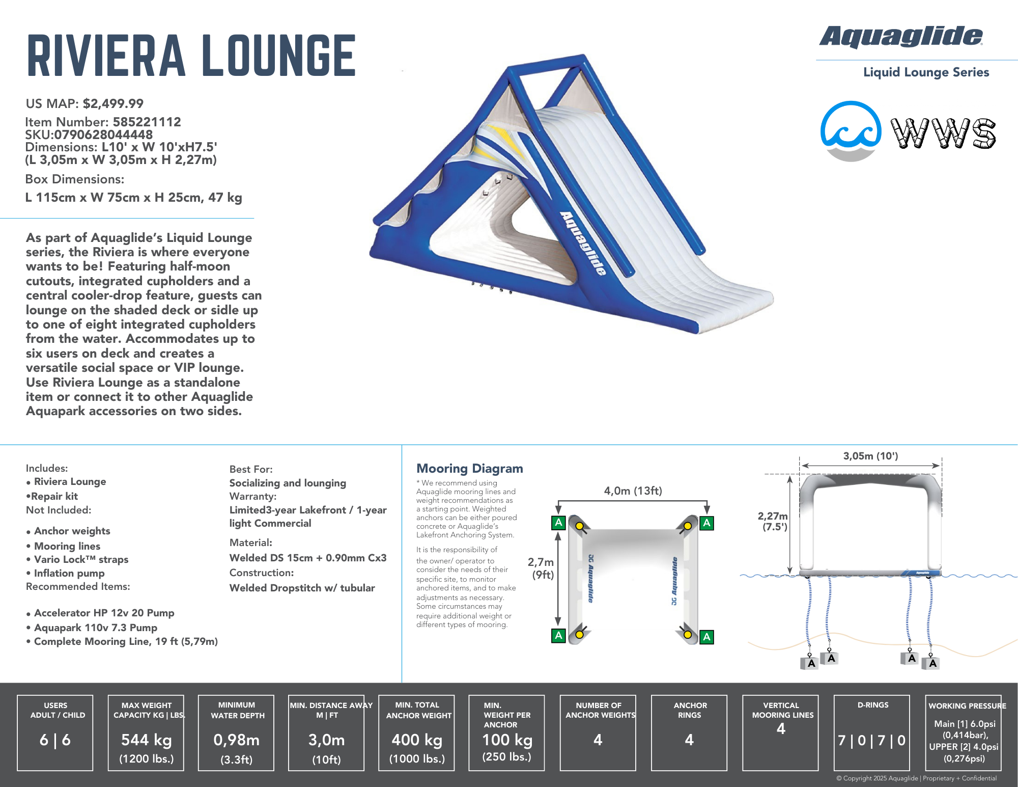 Use Riviera Lounge as a standalone item or connect it to other Aquaglide Aquapark accessories on two sides.