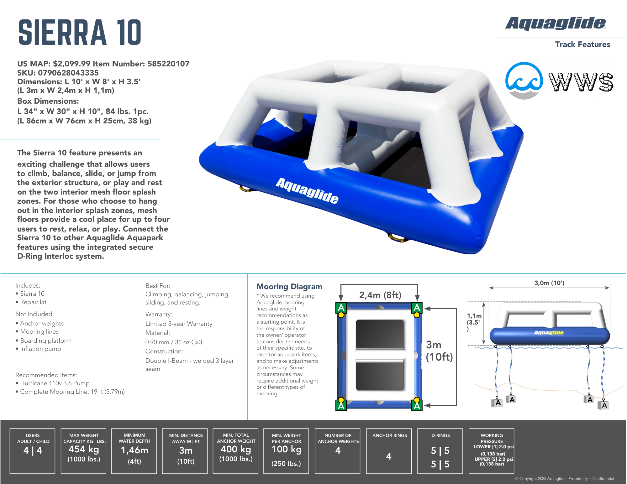 The Sierra 10 feature presents an exciting challenge that allows users to climb, balance, slide, or jump from the exterior structure, or play and rest on the two interior mesh floor splash zones. For those who choose to hang out in the interior splash zones, mesh floors provide a cool place for up to four users to rest, relax, or play. Connect the Sierra 10 to other Aquaglide Aquapark features using the integrated secure D-Ring Interloc system.