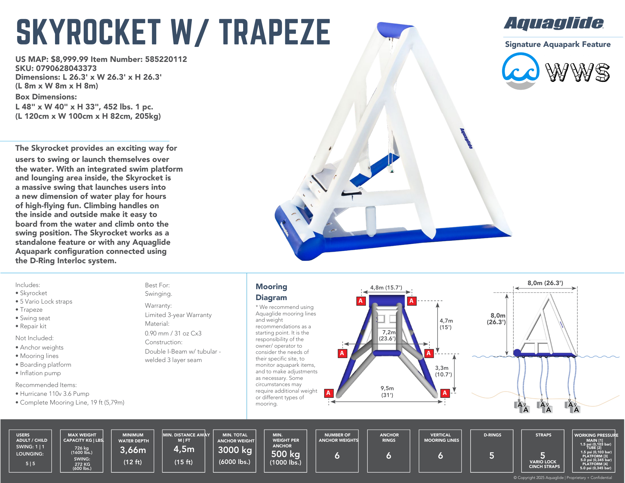 The Skyrocket provides an exciting way for users to swing or launch themselves over the water. With an integrated swim platform and lounging area inside, the Skyrocket is a massive swing that launches users into a new dimension of water play for hours of high-flying fun. Climbing handles on the inside and outside make it easy to board from the water and climb onto the swing position. The Skyrocket works as a standalone feature or with any Aquaglide Aquapark configuration connected using the D-Ring Interloc system.