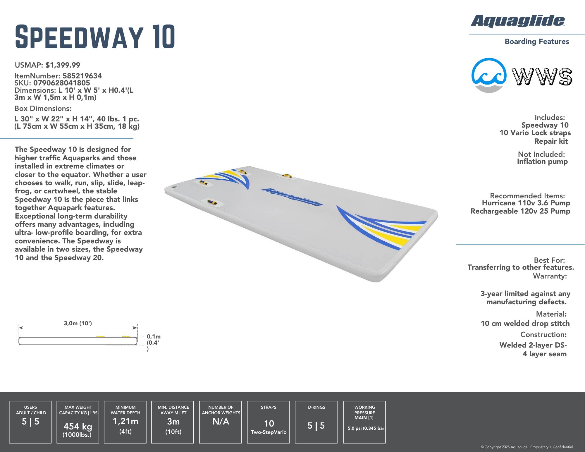 The Speedway 10 is designed for higher traffic Aquaparks and those installed in extreme climates or closer to the equator. Whether a user chooses to walk, run, slip, slide, leap-frog, or cartwheel, the stable Speedway 10 is the piece that links together Aquapark features.