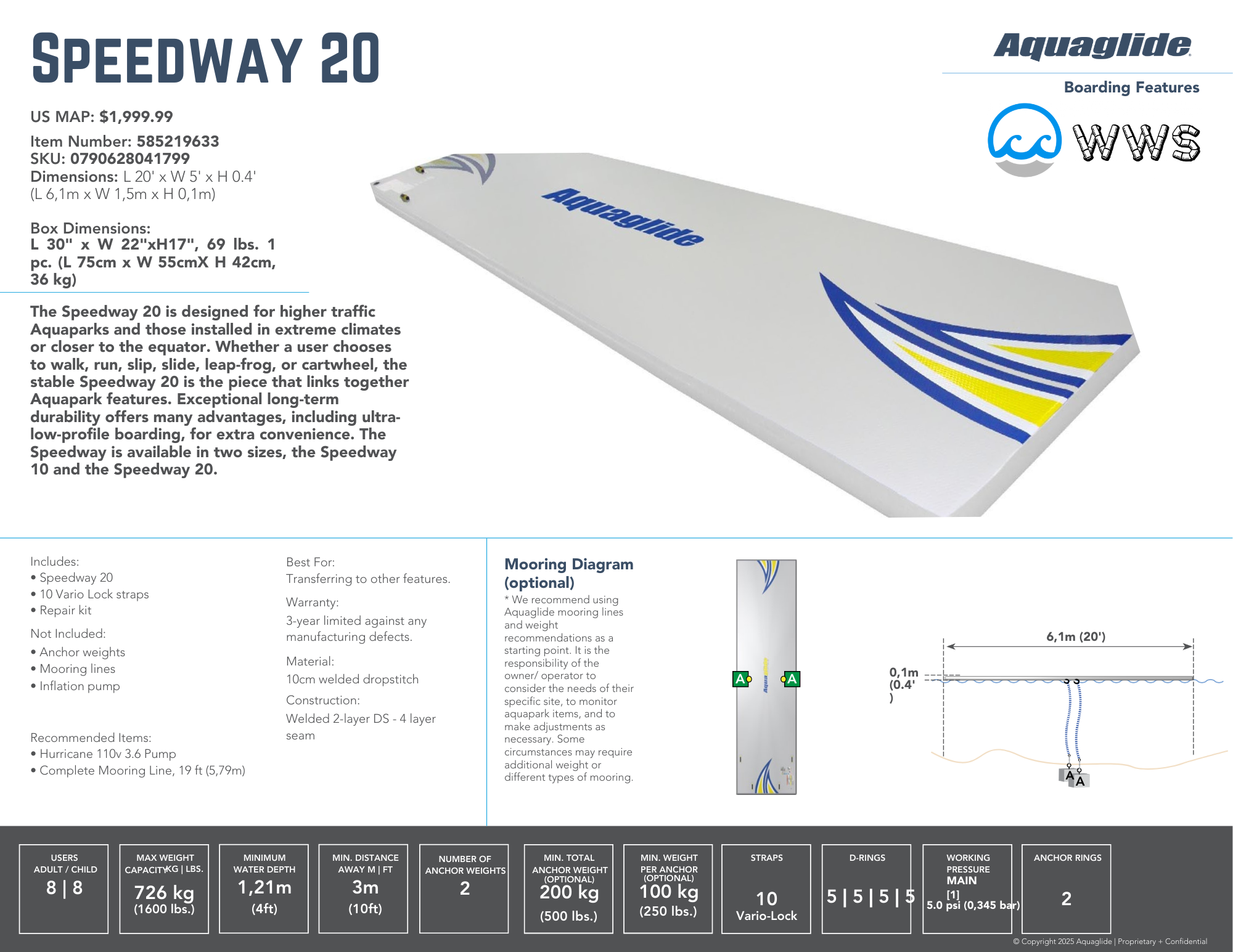 The Speedway 20 is designed for higher traffic Aquaparks and those installed in extreme climates or closer to the equator. Whether a user chooses to walk, run, slip, slide, leap-frog, or cartwheel, the stable Speedway 20 is the piece that links together Aquapark features. Exceptional long-term durability offers many advantages, including ultra-low-profile boarding, for extra convenience. The Speedway is available in two sizes, the Speedway 10 and the Speedway 20.