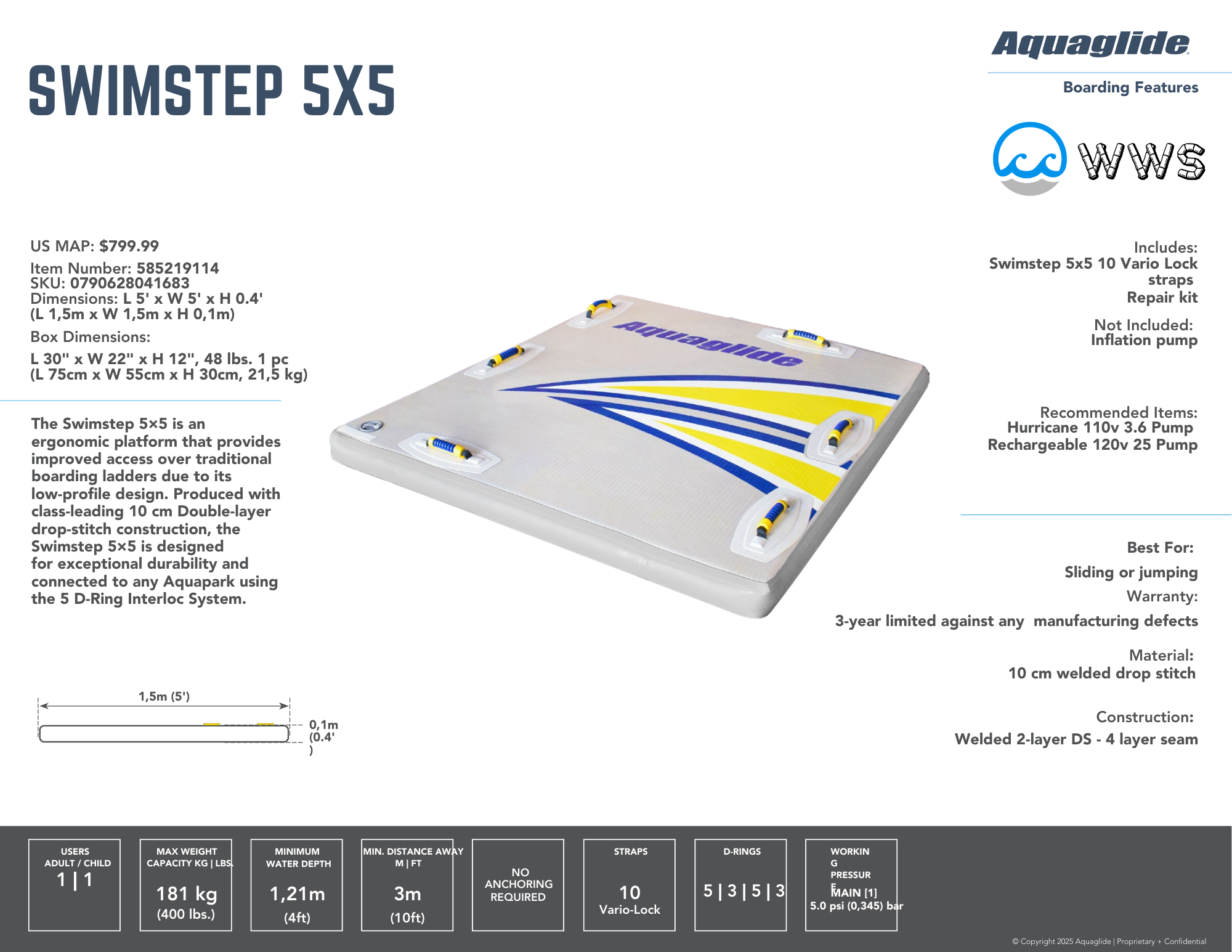 The Swimstep 5x5 is an ergonomic platform that provides improved access over traditional boarding ladders due to its low-profile design. Produced with class-leading 10 cm Double-layer drop-stitch construction, the Swimstep 5x5 is designed for exceptional durability and connected to any Aquapark using the 5 D-Ring Interloc System.