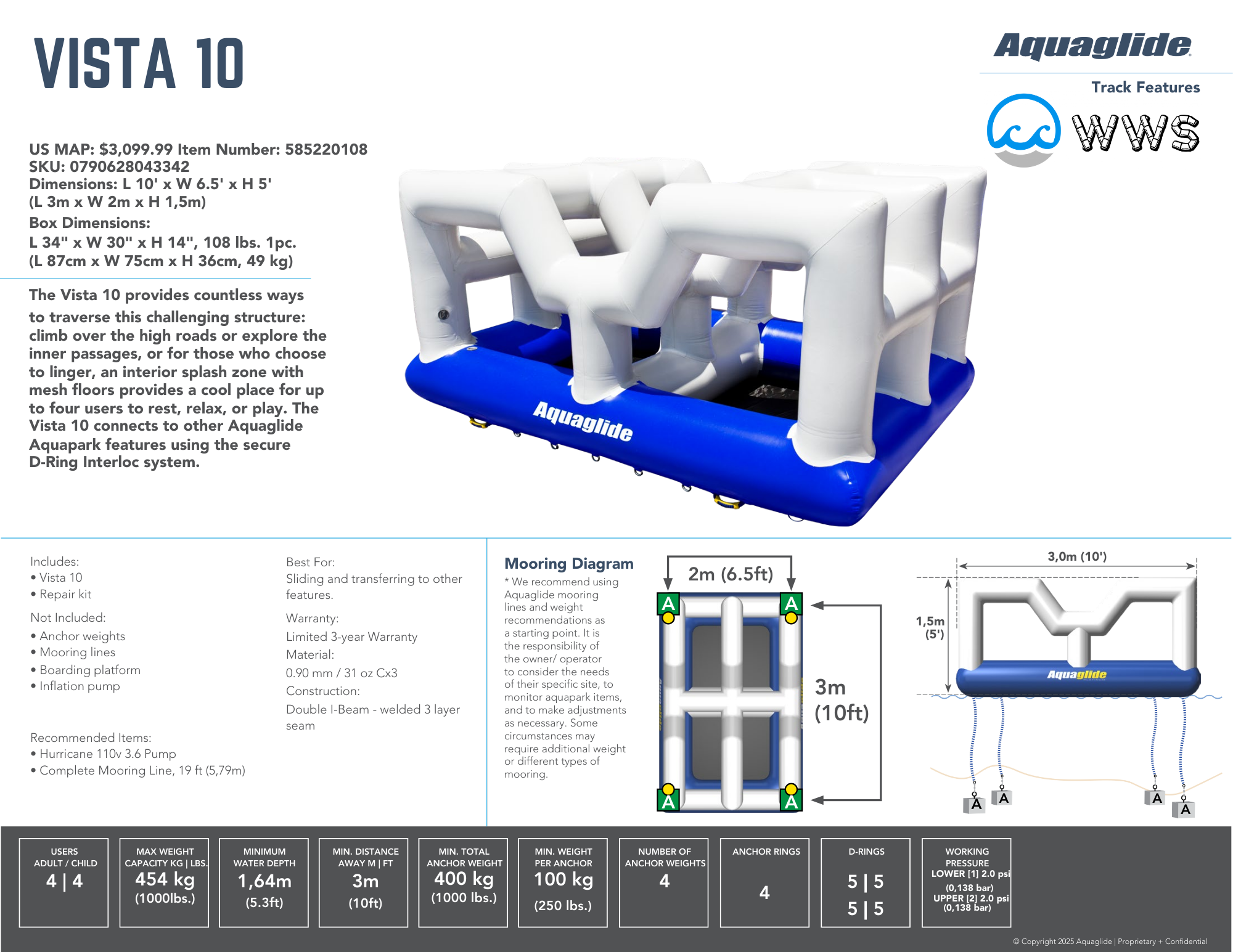 The Vista 10 provides countless ways to traverse this challenging structure: climb over the high roads or explore the inner passages, or for those who choose to linger, an interior splash zone with mesh floors provides a cool place for up to four users to rest, relax, or play. The Vista 10 connects to other Aquaglide Aquapark features using the secure D-Ring Interloc system.