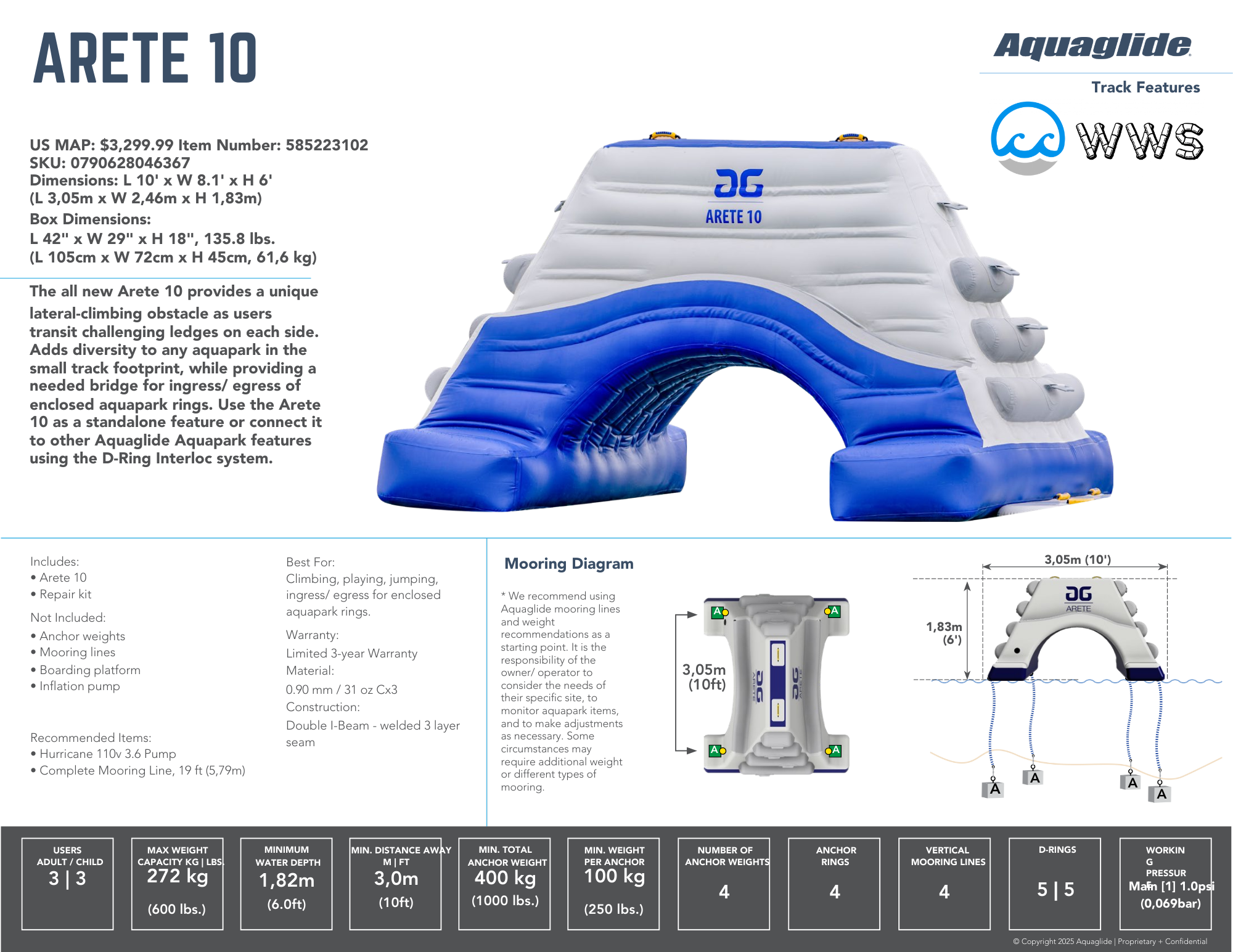 Adds diversity to any aquapark in the small track footprint, while providing a needed bridge for ingress/ egress of enclosed aquapark rings. Use the Arete 10 as a standalone feature or connect it to other Aquaglide Aquapark features using the D-Ring Interloc system.