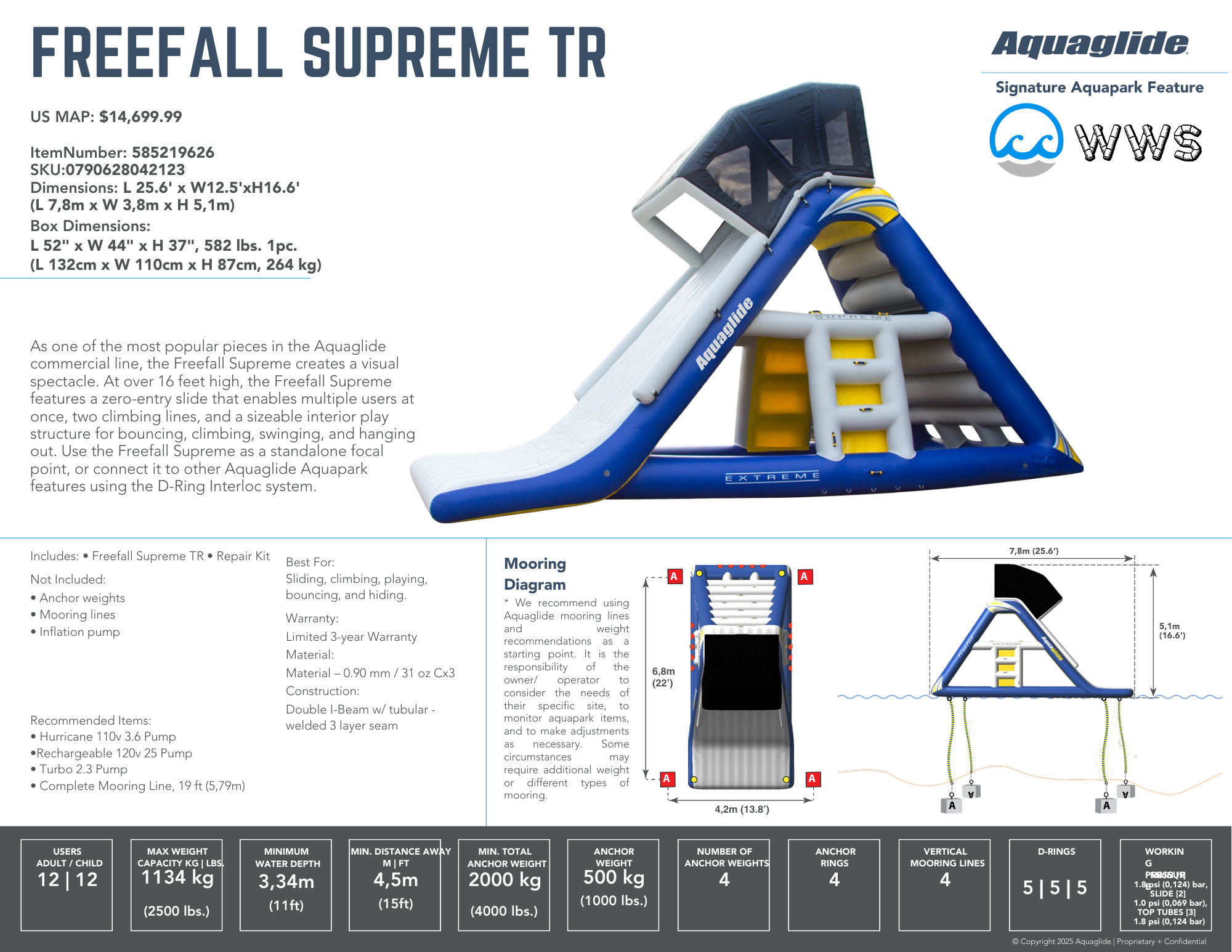 As one of the most popular pieces in the Aquaglide commercial line, the Freefall Supreme creates a visual spectacle. At over 16 feet high, the Freefall Supreme features a zero-entry slide that enables multiple users at once, two climbing lines, and a sizable interior play structure for bouncing, climbing, swinging, and hanging out. Use the Freefall Supreme as a standalone focal point, or connect it to other Aquaglide Aquapark features using the D-Ring Interloc system.