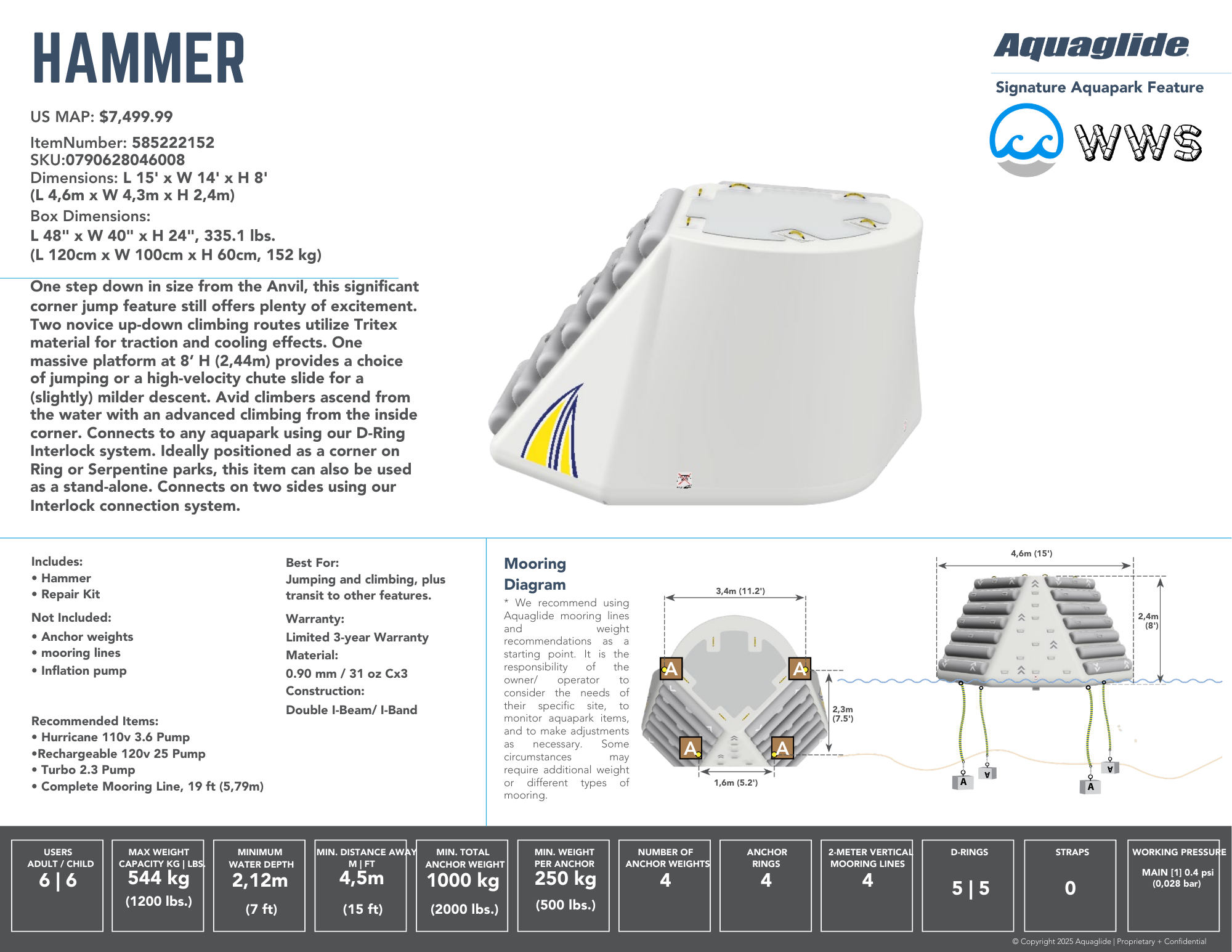 Two novice up-down climbing routes utilize Tritex material for traction and cooling effects. One massive platform at 8' H (2,44m) provides a choice of jumping or a high-velocity chute slide for a (slightly) milder descent. Avid climbers ascend from the water with an advanced climbing from the inside corner. Connects to any aquapark using our D-Ring Interlock system. Ideally positioned as a corner on Ring or Serpentine parks, this item can also be used as a stand-alone. Connects on two sides using our Interlock connection system.