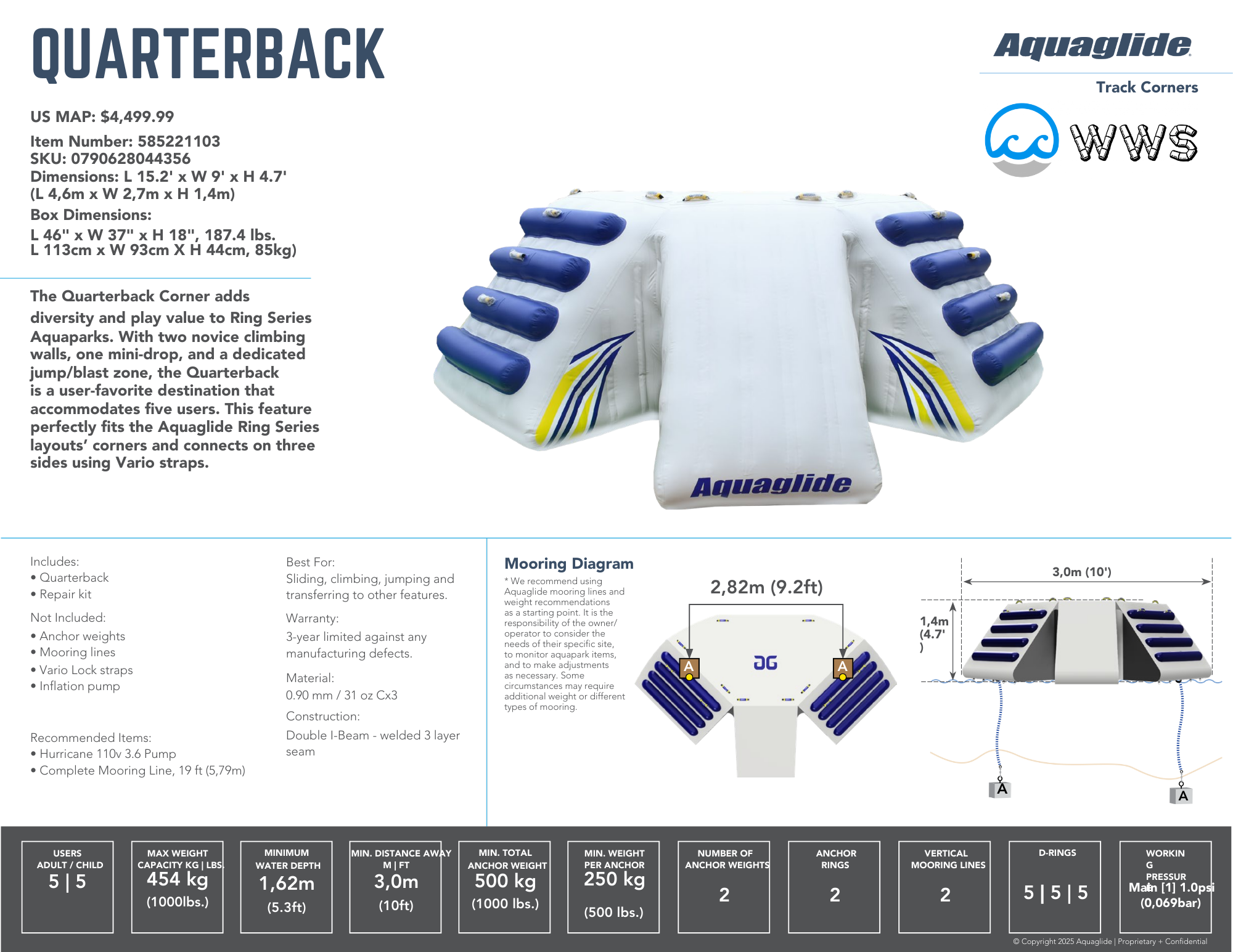 The Quarterback Corner adds diversity and play value to Ring Series Aquaparks. With two novice climbing walls, one mini-drop, and a dedicated jump/blast zone, the Quarterback is a user-favorite destination that accommodates five users. This feature perfectly fits the Aquaglide Ring Series layouts' corners and connects on three sides using Vario straps.