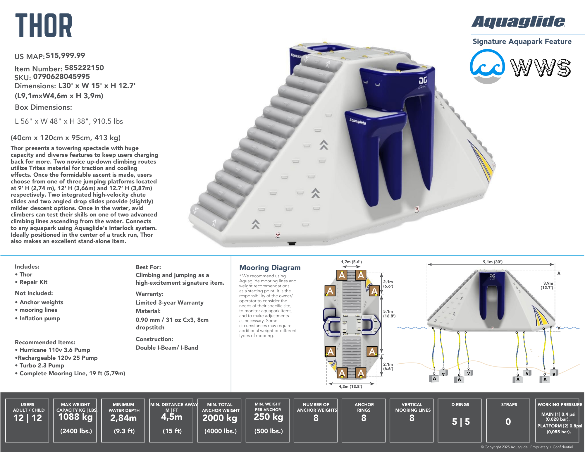 Thor presents a towering spectacle with huge capacity and diverse features to keep users charging back for more. Two novice up-down climbing routes utilize Tritex material for traction and cooling effects. Once the formidable ascent is made, users choose from one of three jumping platforms located at 9' H (2,74 m), 12' H (3,66m) and 12.7' H (3,87m) respectively. Two integrated high-velocity chute slides and two angled drop slides provide (slightly) milder descent options. Once in the water, avid climbers can test their skills on one of two advanced climbing lines ascending from the water. Connects to any aquapark using Aquaglide's Interlock system.