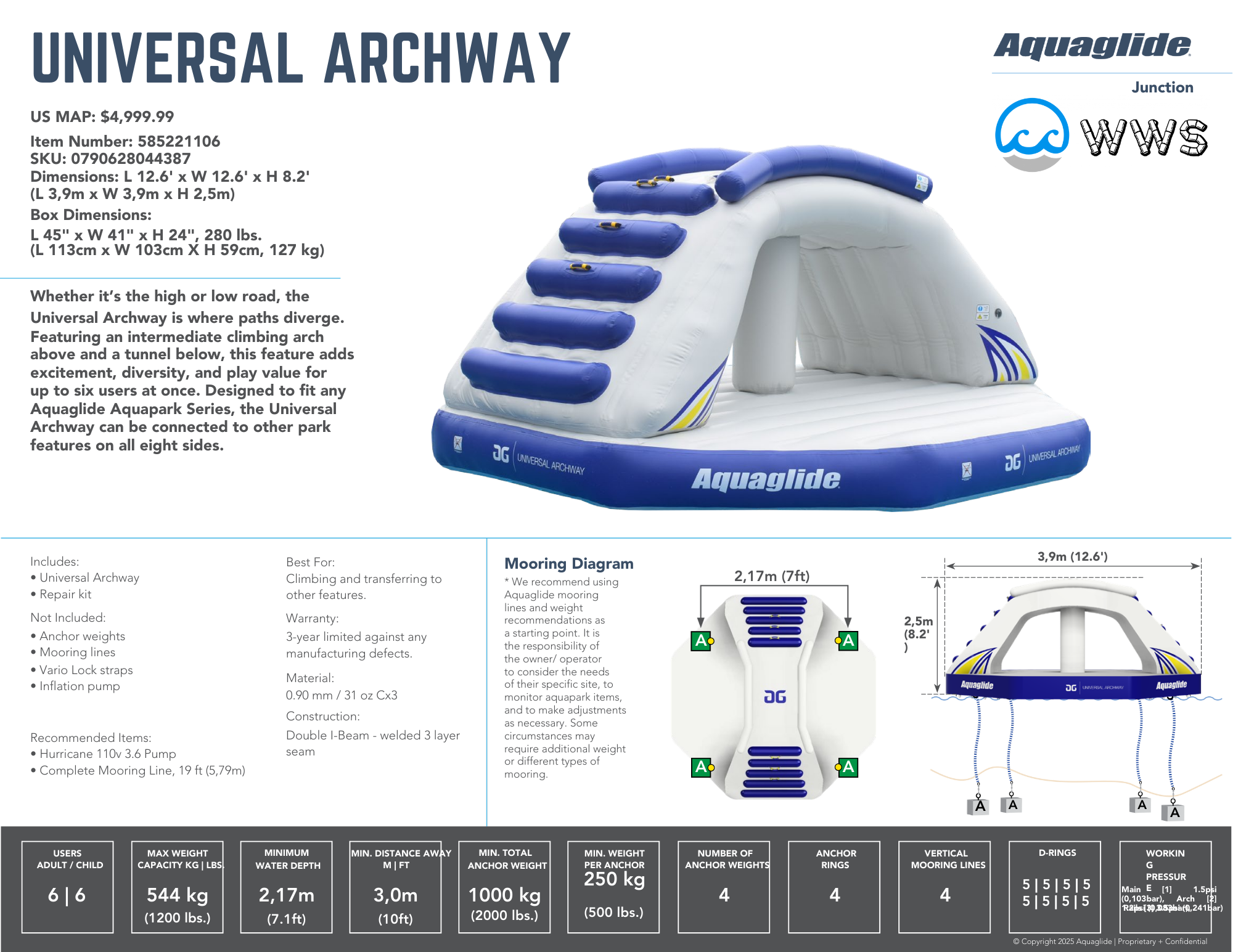 Featuring an intermediate climbing arch above and a tunnel below, this feature adds excitement, diversity, and play value for up to six users at once. Designed to fit any Aquaglide Aquapark Series, the Universal Archway can be connected to other park features on all eight sides.